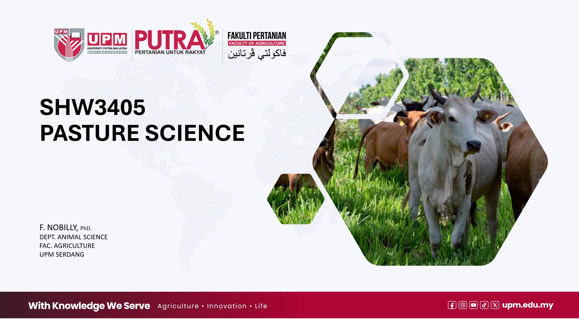 Kursus ini merangkumi kepentingan tanaman pastura sebagai sumber makanan ruminan. Ia termasuk ciri spesies rumput dan kekacang, serta kaedah penubuhan dan pengurusan pastura. Kaedah penggunaan, kualiti pemakanan dan penyimpanan pastura diliputi.((This course encompasses the importance of pasture plants as a ruminant feed source. It includes the characteristic of grasses and legumes species, also methods of establishment and management of pasture. Methods of utilization, nutritive value and conse)